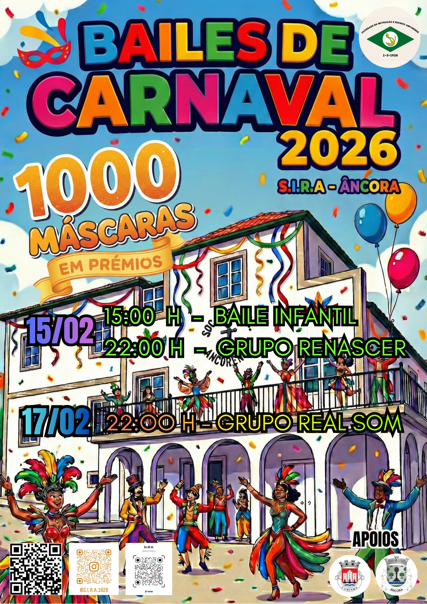 A Sociedade de Instrução e Recreio Ancorense (S.I.R.A. – Âncora) vai promover, nos dias 15 e 17 de fevereiro de 2026, os Bailes de Carnaval 2026, nas suas instalações, numa iniciativa que pretende dinamizar a vida cultural local e manter viva a tradição carnavalesca.