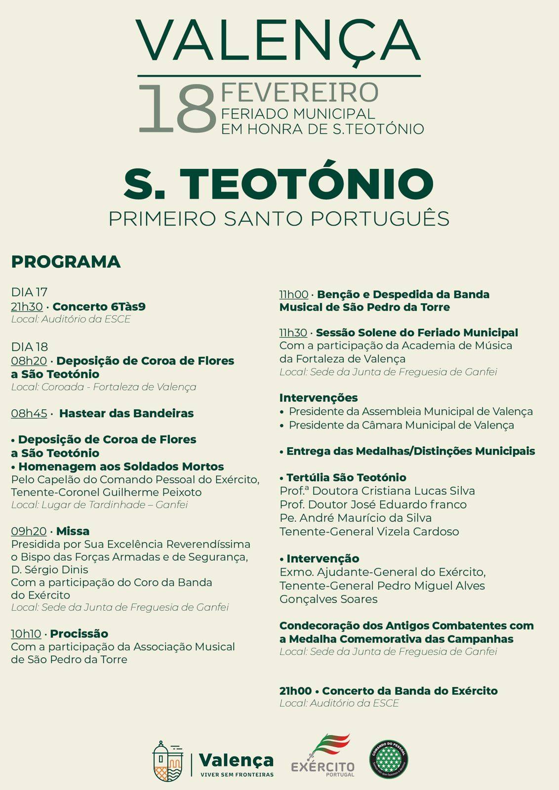 As comemorações deste ano assumem um caráter especial com o envolvimento do Exército Português, que se desloca a Valença para prestar homenagem simbólica a São Teotónio, padroeiro do Comando do Pessoal do Exército. A efeméride reforça, assim, a dimensão histórica e espiritual associada ao primeiro santo português, natural da freguesia de Ganfei.
