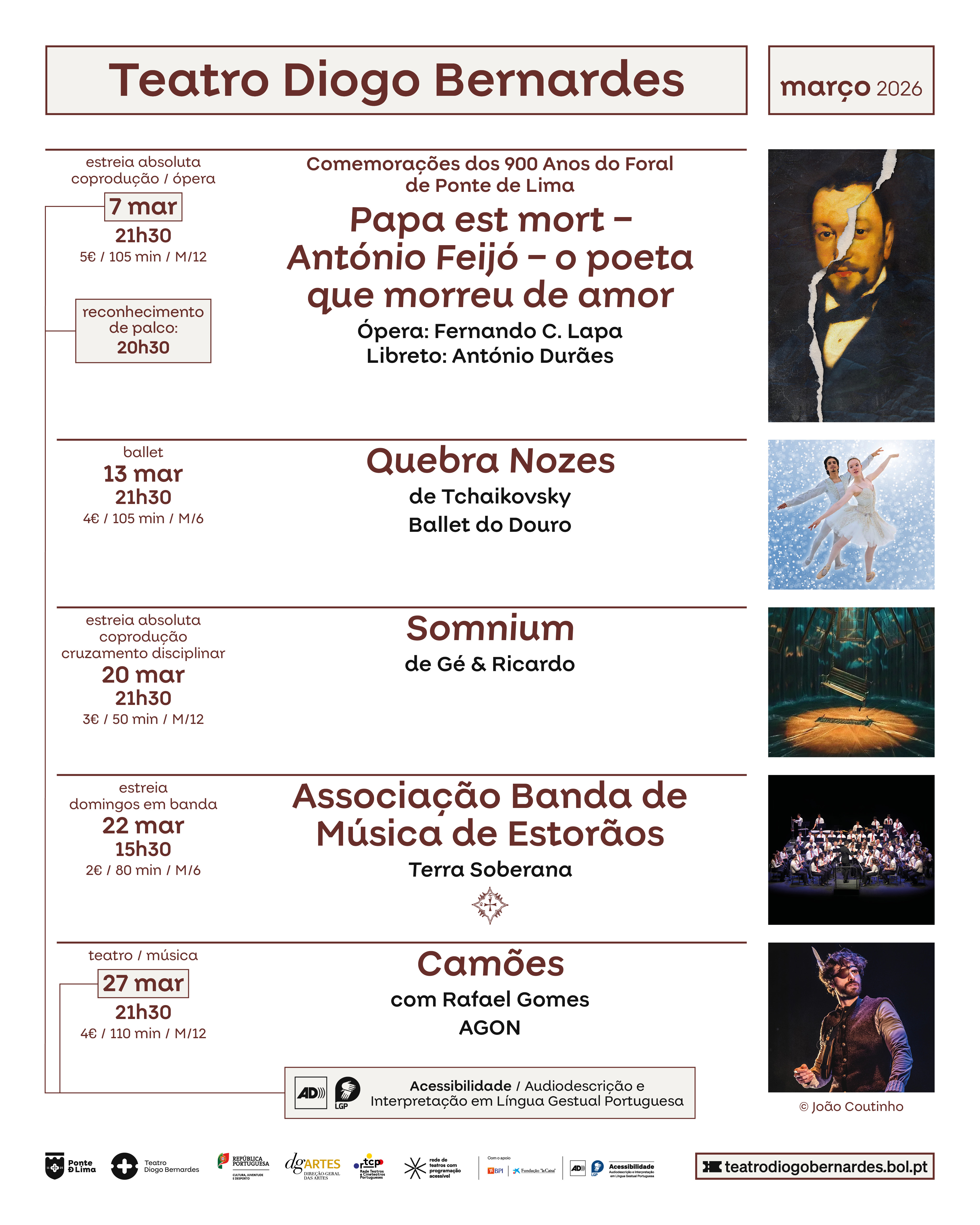 O Município de Ponte de Lima, através do Teatro Diogo Bernardes, apresenta para março de 2026 uma programação cultural rica e estimulante, que integra diversas linguagens artísticas — ópera, teatro, dança, música e cinema — contando com a participação de criadores e companhias de destaque no cenário nacional e internacional.