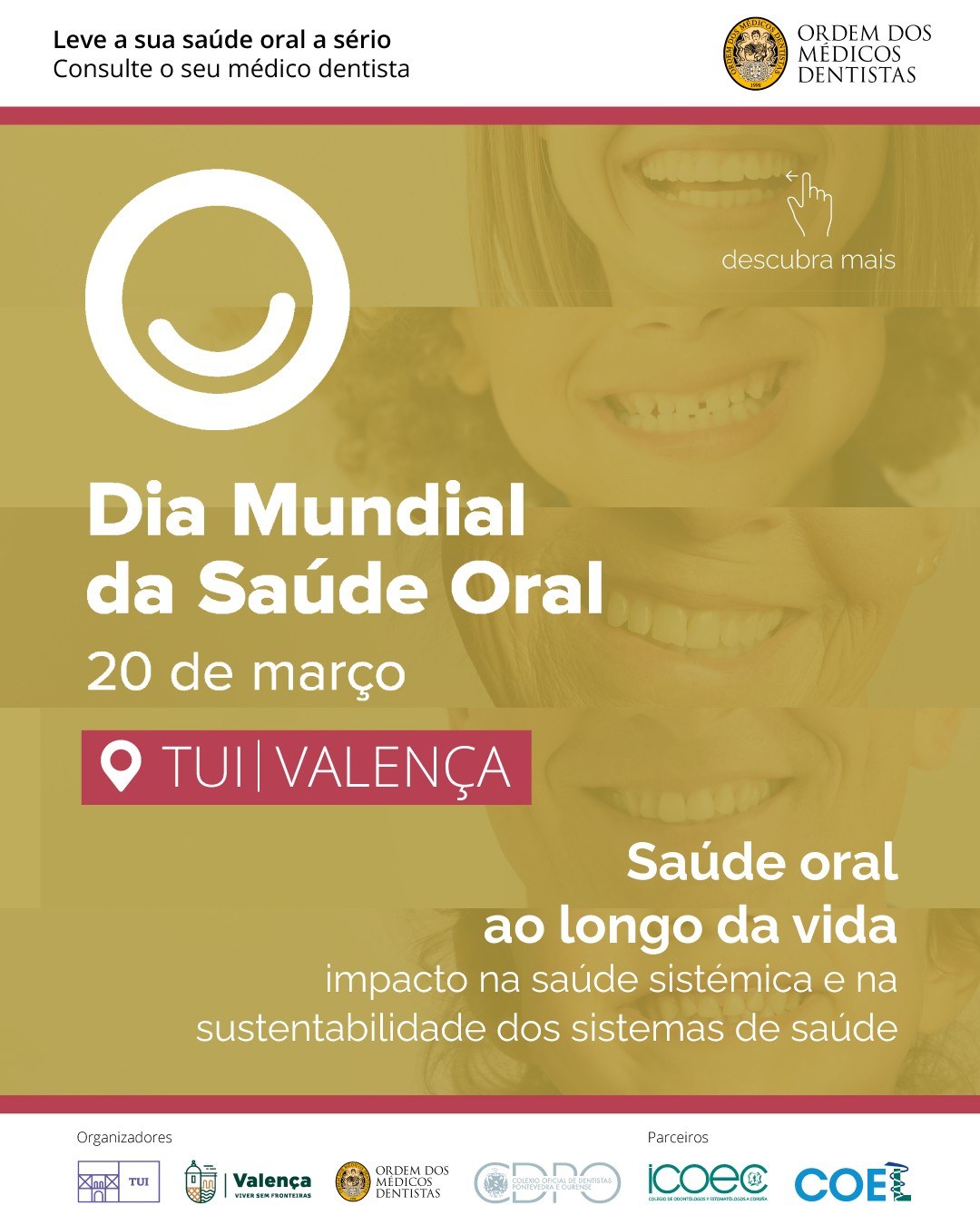 O Município de Valença associa-se à comemoração do Dia Mundial da Saúde Oral, que terá lugar no próximo 20 de março, no Agrupamento de Escolas Muralhas do Minho, numa iniciativa promovida pela Ordem dos Médicos Dentistas, em parceria com a Câmara Municipal de Valença, o Ayuntamiento de Tui e os Colégios Oficiais de Médicos Dentistas de Pontevedra y Ourense, Lugo e A Coruña.