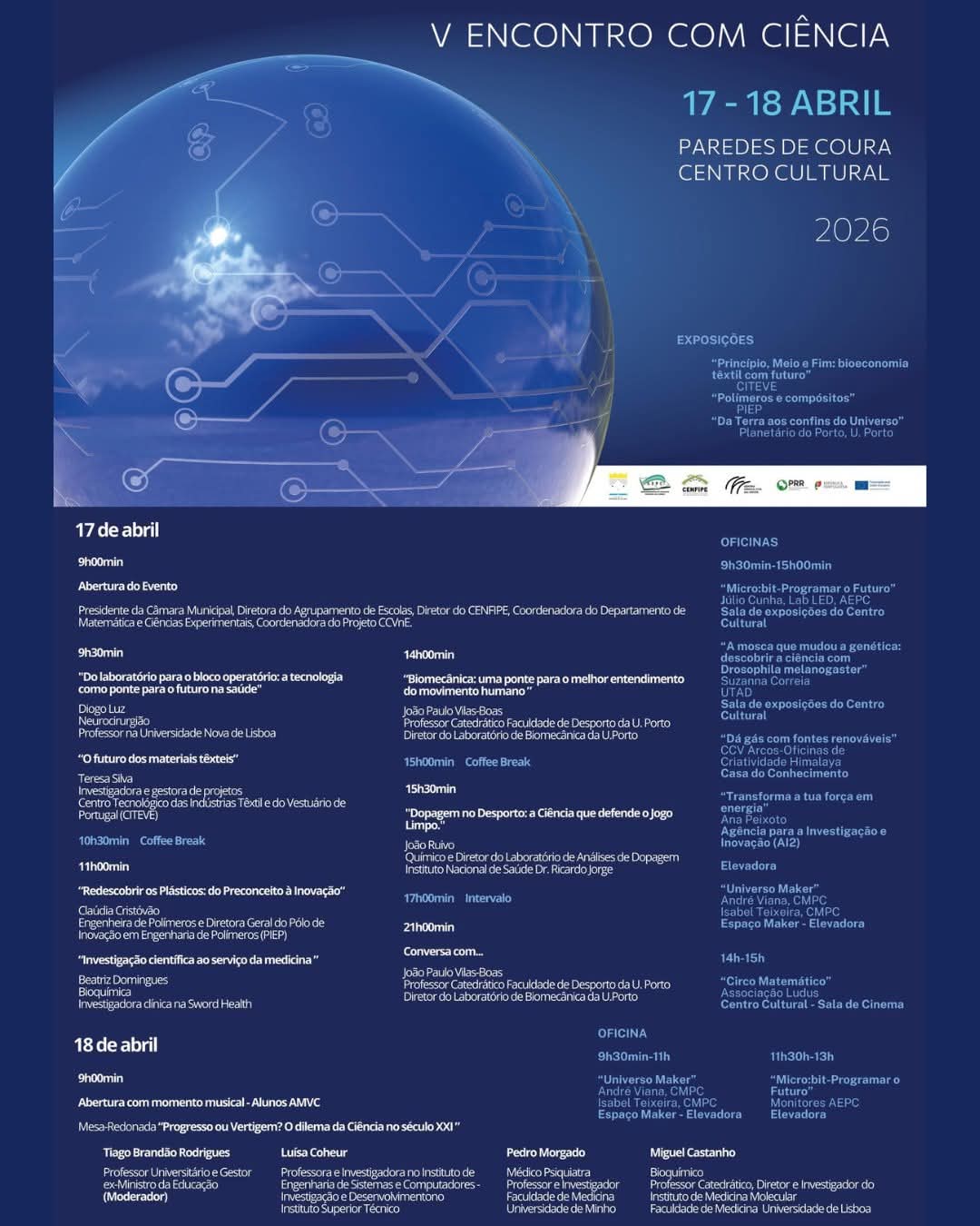 Diogo da Luz, neurocirurgião e professor da Universidade Nova de Lisboa, Beatriz Domingues, bioquímica e investigadora clínica na Sworth Health, e João Paulo Vilas-Boas, professor catedrático da Universidade do Porto, são alguns dos palestrantes deste V Encontro com Ciência sob o tema “Ciência, ponte para o futuro” promovido pelo Agrupamento de Escolas em parceria com Centro Ciência Viva na Escola - SOS Terra e o Município de Paredes de Coura, e que também conta na manhã de sábado com uma mesa-redonda cujo tema é “Progresso ou vertigem? O dilema da Ciência no séc XXI”.
