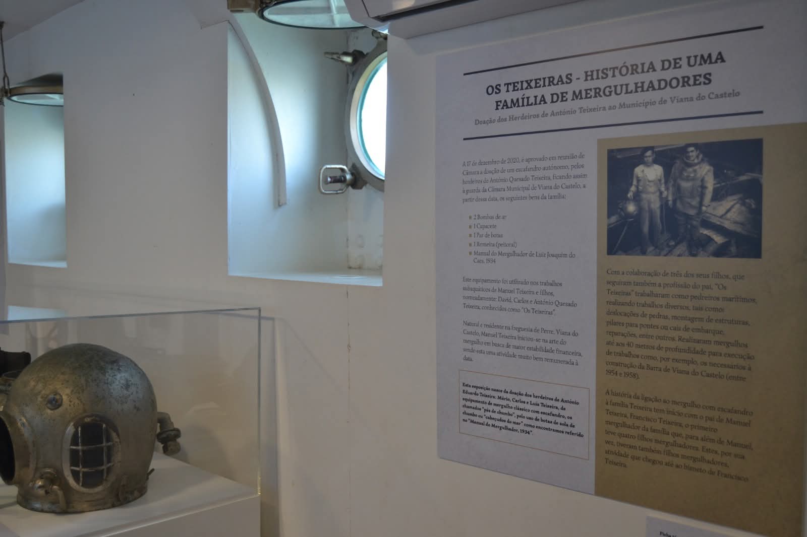 Esta exposição nasce da generosa doação de um espólio original por parte da família Teixeira — escafandro / equipamento de mergulho dos anos 50, documentos e memórias, que permitiu preservar e dar a conhecer práticas, saberes e experiências associadas ao mergulho numa época em que o mar era, simultaneamente, sustento, risco e descoberta.