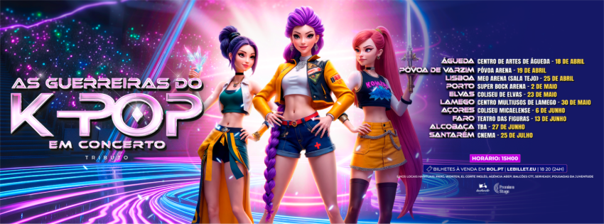 Depois de conquistar fãs em todo o mundo, “As Guerreiras do K-Pop Em Concerto (Tributo)” chega a Portugal como um dos projetos ao vivo mais impactantes do momento. Inspirado no universo do sucesso global da Netflix, este concerto estará de norte a sul do país, entre Águeda, Póvoa do Varzim, Lisboa, Porto, Elvas, Lamego, Açores, Faro, Alcobaça e Santarém.