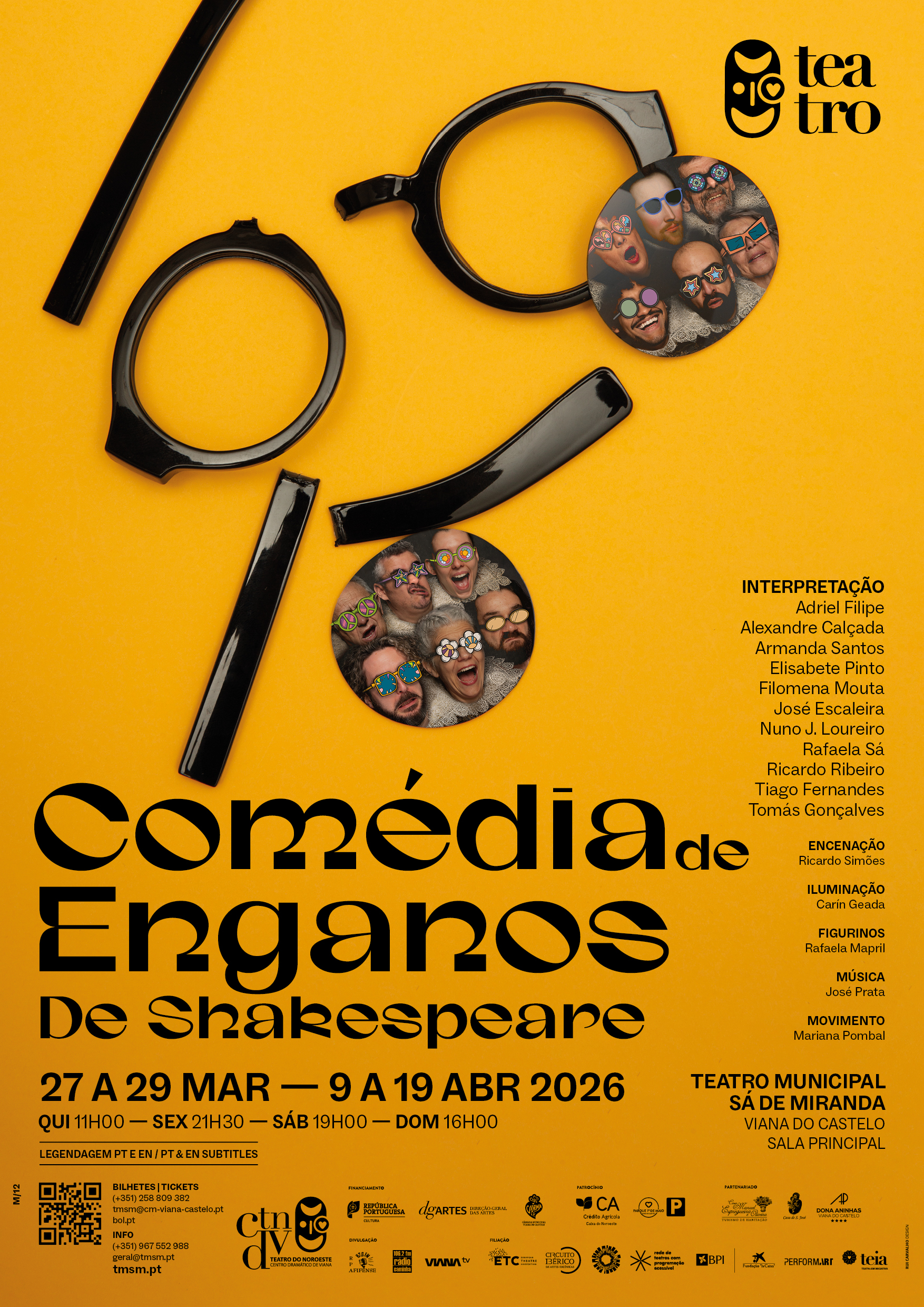 A interpretação é de Adriel Filipe, Alexandre Calçada, Armanda Santos, Elisabete Pinto, Filomena Mouta, José Escaleira, Nuno J. Loureiro, Rafaela Sá, Ricardo Ribeiro, Tiago Fernandes e Tomás Gonçalves. Comédia de Enganos entra em cena no Teatro Municipal Sá de Miranda, em Viana do Castelo, de 27 a 29 de março e de 9 a 19 de abril, quintas-feiras às 11h00, sextas às 21h30, sábado às 19h00 e domingos às 16 horas.